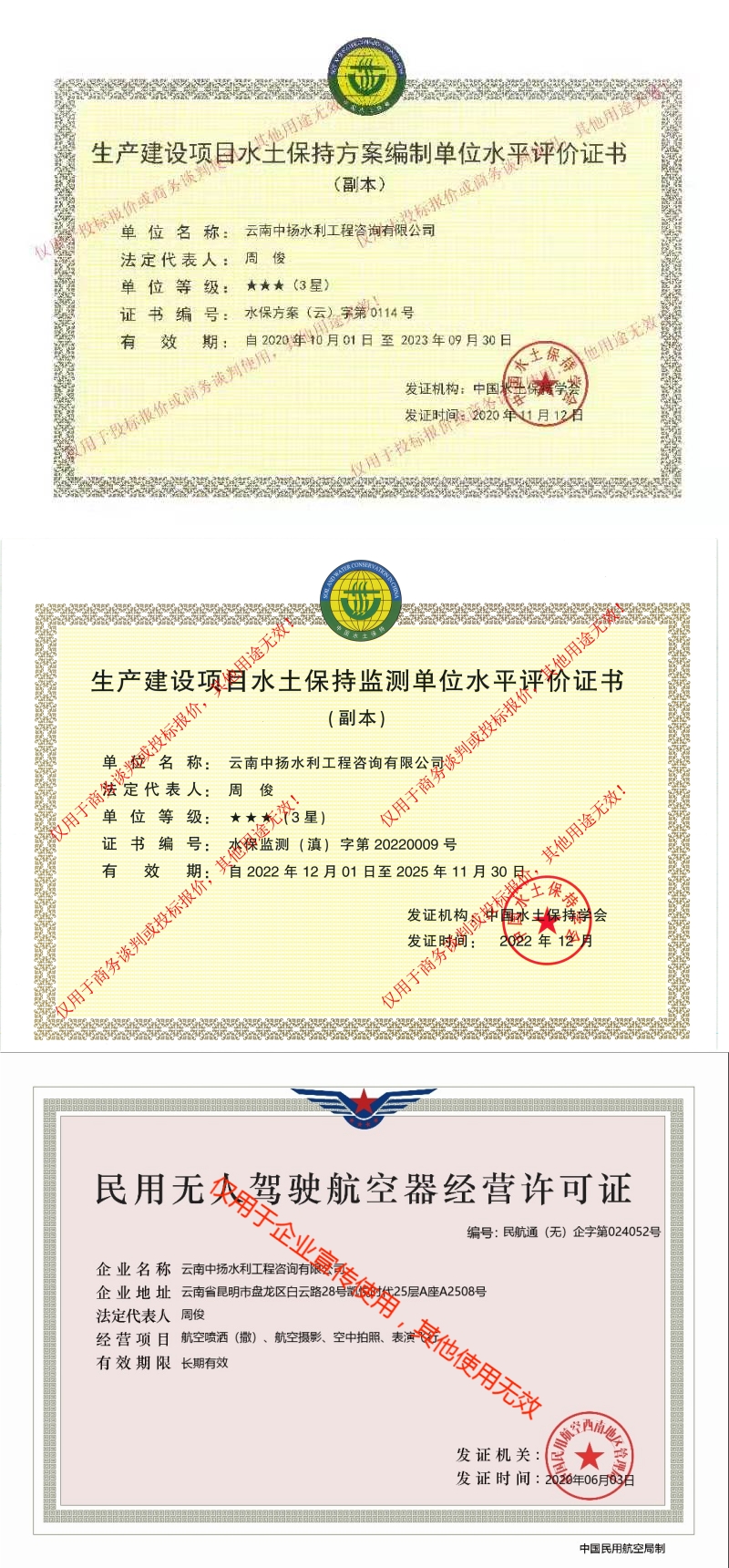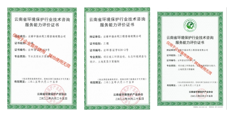 云南中揚水利工程咨詢有限公司成立于2011年,注冊資金100萬元整。公司從事的主要業(yè)務為生產建設項目水土保持咨詢設計(水保方案編制、水保監(jiān)測、技術評估及咨詢)、水土保持規(guī)劃、水利工程設計(農田水利、河道)、可行性研究報告編制、土地復墾等。公司已取得水土保持方案編制、水土保持監(jiān)測、工程咨詢備案、環(huán)境污染治理、環(huán)境保護行業(yè)技術咨詢服務能力評價證書、民用無人駕駛航空器經營許可證等資格證書,是云南省水土保持學會和云南省環(huán)境保護協(xié)會會員。